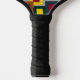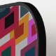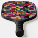 Cette pagaie à pickleball a un design géométrique de carrés à l'intérieur des carrés en brun, noir, brique, jaune, turquoise, vert, violet, or, rose, rouge, gris sur un terrain de gris plus clair.