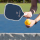 This modern carbon fiber pickleball paddle design features a blue background, with your initials in white highlighted in red, with a custom script for a look that is simple and stylish. This Pickleball Paddle is ideal for wide range of players and experience. Featuring a hand wrapped grip and fiberglass & polypropylene honeycomb core, this lightweight paddle offers excellent feel and ample power for the competitive player. The smooth hitting surface and conventional shape allows for a bigger sweet spot for more solid contact. Any design questions just send a chat or an email to v.dye@rcn.com and we'll be delighted to assist.