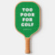 Un motif subtil de points verts sur un arrière - plan vert a un texte drôle, blanc, qui dit "trop pauvre pour le golf" avec le nom personnalisé texte en dessous il fait de cette pagaie à boules de cornichons un cadeau amusant pour quiconque aime le jeu et n'est pas un golfeur mais aime encore la scène du country club.