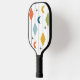 Cette pagaie de pickleball a un design moderne du milieu du siècle de lignes verticales avec des diamants et des boomerangs, avec des starbursts dispersés dans l'arrière - plan.