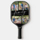 This personalized modern pickleball paddle features 4 custom photos, family name and year date, and the word “family” in elegant handwritten calligraphy script. The black background can be changed to your own custom color.