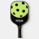 Paddle personnalisé unique et amusant imprimé personnalisé avec un grand nombre d'icônes de boule de pickleball jaune néon brillant design avec votre nom dans une police classique sportive et numéro de téléphone ou de contact optionnel en petit texte.