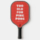 Un motif subtil de points rouges sur un arrière - plan orange avec un texte drôle, blanc, qui dit "trop vieux pour le ping pong" avec un nom personnalisé texte en dessous, fait de cette pagaie à boules de cornichons un cadeau amusant pour quiconque aime le jeu mais connaît leurs limites en matière de vitesse et de coordination oeil-main.