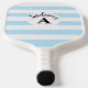 This sporty paddle features bold horizontal stripes in crisp blue and white, creating a dynamic rhythm that suggests speed, clarity, and playfulness. At its center, a round white emblem anchors the design, overlaid with elegant cursive text and a monogram-style element. The handle boasts a textured white grip for comfort and control, while the overall layout combines personal flair with clean aesthetics. Ideal for game lovers who value expression both on and off the court.