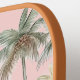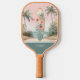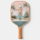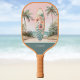 This pastel beachy pickleball design features a tropical flowered surfboard sticking up out of the sand against a tropical beach and pastel pink sky. This surfing inspired pickleball paddle would make a great gift for a beach lover or surfer, especially if they like the warm waters of tropical beaches or the scent of beautiful tropical flowers. Your or your recipient's monogram initials appears in light sandy cream color against a teal-ish sage green background.
