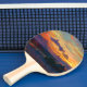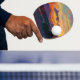 Un design artistique d'un beau coucher de soleil montrant également des rochers, la plage et un homme de pêche.