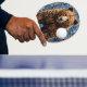 OEuvre d'art animée représentant un ours avec un riche manteau de fourrure texturé, dressé contre un arrière - plan patchwork aux tons bleu et gris. L'ours est imposant et vivant, attirant l'attention avec ses caractéristiques réalistes.