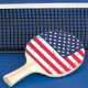 Ping pong paddle montré avec un imprimé patriotique USA Flag. Customisez cet objet ou achetez tel quel.