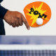 Palette de ping-pong dans l'orange avec la forme bordée déchiquetée jaune et le mot "prisonnier de guerre !"