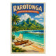 Travel poster featuring Rarotonga, Cook Islands, in a classic retro travel-poster style. Central focus on the lush volcanic island ringed by a brilliant turquoise lagoon and coral reef, with jagged green mountains rising dramatically from the tropical jungle interior. Palm-fringed white sand beaches and a traditional Polynesian outrigger canoe rest along the shoreline under glowing Pacific sunlight. Soft trade-wind clouds drift across a deep blue sky, creating a relaxed island paradise atmosphere. Vibrant tropical color palette of lagoon turquoise, jungle emerald, coral sand white, and warm golden sunlight. Clean graphic illustration with subtle vintage grain texture. Bold vintage typography headline: “RAROTONGA – HEART OF THE COOK ISLANDS”. Vertical 2:3 layout, high-resolution, print-ready.