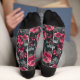 Raspberry, burgundy flowers with grey leaves on a dark grey background.