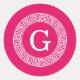 Raspberry Wht Greek Key Rnd Frame Initial Monogram Classic Round Sticker