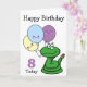 Cute card with changeable age and templates to add your own message on the inside. Fun green cartoon rattle snake. He has oval eyes with raised eyebrows, a rattler on the end of his tail and his tongue sticking out of a cheeky smile and three coloured balloons is featured on the front, inside and back of this adorable card.