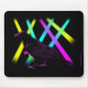A raven standing and facing left, holding a magenta glowstick with its wing, in front of several colourful glowing spotlight beams.