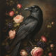 A richly detailed Old Masters–inspired oil painting featuring a majestic black crow perched among heirloom roses and shadowed florals. Deep velvety blacks contrast with blush and crimson blooms, creating a dramatic, romantic composition with timeless elegance.
