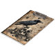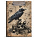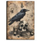 A raven is perched on a skull resting on a stack of books, surrounded by candles. Arcane symbols and illegible text on old, grungey parchment completes the illustration from a book of spells. Gothic, haunting, and perfect for those who walk on the darker side.