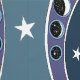 Tribal raven sitting in a circle of stars and potashes of the moon all drawn in an art nouveau style in a backdrop of blues and purple.