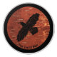A simple, black silhouette of a Raven (Corvus corax) on a background image of the reddish reverse side (inside) of birch bark. The raven image has been given a slight "rough" or "worn" effect. Add your own text.