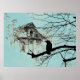 A silhouette of the bird and bare branches. It could be raven, crow or rook. Derelict Russian Victorian wooden house. You can change the colour of the background if you press "customize" button.