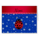 Idées mignonnes de cadeau de Noël de coccinelle. Créez votre propre coutume personnalisée avec juste ajoutent votre nom (nom de famille), monogramme, salutation ou initiales ou dire la coccinelle mignonne de bande dessinée avec une rayure blanche bleue de coeur d'arrière - plan et de rouge de motif de Noël de flocons de neige.