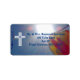 These lovely labels feature an enhanced nature photograph of red and yellow tulip petals and green foliage taken from a low point of view, with blue sky and bright sun above. A blue and white cross stands on the left. Suitable for boy or girl. Customize blue text.