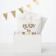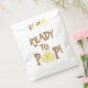 This custom treat bag features a cute baby shower popcorn theme. The phrase "Ready to Pop" is printed across the front in a whimsical toasted brown font. The letter "O" is replaced with a happy popcorn kernel that has a cute little happy face.