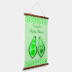 This awesome wood topped wall tapestry features a graphic image of a green Pea pod containing 3 green peas. The largest pea has a cute little face with eyes and a mouth. On the other side of the pea pod in darker green text it says "Ready to Pop". There is a pattern of little green peas in the background. There is custom text so you can include the name of the Mother to Be.