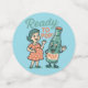 "READY TO POP!" This absolutely charming retro 1950s-inspired design features a sweet pregnant woman in a coral polka dot dress standing next to a cheerful anthropomorphic soda pop bottle—both ready to pop! The vintage cartoon aesthetic, warm nostalgic color palette, and playful pun create the perfect celebration of expectant motherhood.