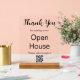 Thank you for coming to our Open House. Please scan to sign in. Those are the words that currently appear above the QR code image. You can edit the black display text to show a custom message if desired. The top line is an elegant script that says Thank You. The rest of the text is not a script. A QR code is near the bottom for your guests to scan to sign in. Remember to enter your website for the QR code to work correctly.