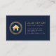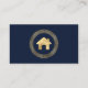 This real estate business card features a faux gold house logo framed by a circular Greek key motif on the left and simple, gold coloured sans serif text on the right, with a vertical line between, on a navy blue background. A larger version of the house logo appears on the reverse side.