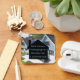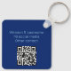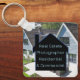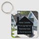 Key ring advertising for realtor or real estate photographer. One side of square keychain has a black house shape with light blue printed text inside. This is printed over the image of a modern house, which is a template and can be replaced with a photo of your own. On the other side, add your QR code or logo with more text for name, location, social media, etc.