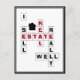 Fun realtor postcard-cum-marketing flyer, with text designed in a crossword format, as a non-subtle reminder to your future clients. The text reads I SELL REAL ESTATE REALLY WELL in black and red typography, and there's even a little house silhouette too. Sure to get your message across really well! On the reverse you can personalize your own branding message and contact details by replacing the customizable text.