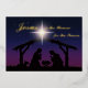 This beautiful Nativity scene Christmas card has a nightime view of the stable and manger with baby Jesus and Mary and Joseph overlooking the Lord Jesus with a bright shining star above. The words "Jesus is the Reason for the Season" are done in real gold foil in the upper portion of the front side of this flat card. The back has a SIMULATED gold look scroll frame with customizable goldtone wording that can be changed to say whatever you want it to.