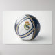 Wall art: A design of a sleek and elegant football, where the Real Madrid crest is creatively integrated into the ball. The ball features clean and interwoven lines, with highlights in the royal colours of white, gold, and navy blue.