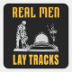 Cool design featuring a track builder at work and the quote "Real men lay tracks".