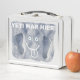 This is a standard metal lunchbox that appears to work just fine. We designed this box ourselves with an uploaded photo and custom text on the front and back. It looks absolutely beautiful except the front of the lunchbox is not centered like it shows in the photo. The print borders don't align with the inset flat part of the box where the preview photo online showed it perfectly centered in there. The back looks nice and centered though.