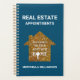 Élégant RÉALTEUR Turquoise Parties scintillant IMMOBILIER Rendez-vous Planificateur avec TEXTE PERSONNALISABLE, conçu pour garder trace de tous les rendez-vous que vous ferez à partir de vos nombreuses références. TEXTE EST PERSONNALISABLE pour que vous puissiez personnaliser le libellé en fonction de vos préférences. Le texte indique IMMOBILIER et NOMINATIONS. Le texte à l'intérieur de la fausse maison de parties scintillant d'or lit BÉNÉFICES SUR VOTRE PROCHAINE NOUVELLE MAISON en typographie blanche. Le O de HOME est remplacé par une clé. Ce planificateur immobilier serait un grand ajout à votre entreprise immobilière. Choisissez parmi une large sélection de designs immobiliers pour votre entreprise de solneur ou d'agence, conçus sur une gamme de produits par Berean Designs.