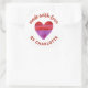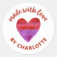 Un autocollant personnalisé "Fabriqué avec amour" avec un coeur rouge et violet peint sur un arrière - plan de couleur blanche. Faites-le le vôtre en ajoutant votre propre nom. Une jolie touche de finition pour tous vos cadeaux faits main. Conçu pour vous par Blackberry Boulevard.