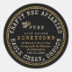 Black Label with honey-coloured and white text with realistic bee and dotted border.