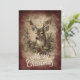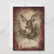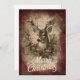 Share holiday cheer with this richly detailed card featuring a realistic deer framed by a festive wreath of holly, berries, and pinecones. The textured red and brown background with faint cursive script adds vintage warmth and woodland elegance.