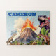 This custom kid's puzzle features a prehistoric dinosaur theme with realistic looking dino illustrations. An image of an exploding volcano is pictured in the centre, with dinosaurs roaming in front of it. A scary tyrannosaurus rex is running up from behind. A sample name is printed at the top which you can personalize to include your own custom name or text.