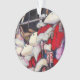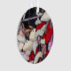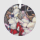 Original whimsical painting of Holiday Dollys by well-season Fine Art Artist, Gaye Elise Beda. A gathering of anthropomorphic mice is dressed in festive, holiday-themed clothing. Their bright red outfits and striped socks create a joyful and playful scene, with each mouse uniquely adorned. The background suggests a wintry setting, enhancing the festive mood.