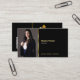 Professional real estate business card featuring a bold black background, gold accent line, and a stylish gold house logo. The design includes a space for your photo and a scannable QR code, perfect for directing clients to your listings, website, or digital portfolio.