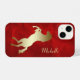 Here's a unique phone case that features a beautiful gold silhouette rearing horse image against a gradient burgundy red background. Add the name in matching gold on the right, and you have an elegant case, especially for anyone who loves horses. Classy!