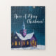 This layered graphic, depicts a snow-covered, steepled, church of purple, with brightly-lit windows, on a snowdrift, with tall, trees in the background-against a starry, midnight sky, of deep blue, and green, blended together, displaying a familiar, Holiday greeting. This scene reminds us all, of why we celebrate such a joyous, and Holy time, with our loved ones, at this time of year!