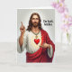 This card features a waist-up portrait of a man with flowing brown hair, a neat beard, and bright blue eyes set against a pale, open background. He wears a white tunic under a deep red draped cloak, with folds that feel carefully drawn and a steady, inviting gaze that leans more friendly than stern. His right hand is raised with one finger pointing upward, while his left rests close to a glowing red heart emblem on his chest that gives off soft golden rays, like a quiet promise shared between close companions 🌷. Around his neck hangs a thick gold-toned chain with a cross pendant, adding a modern edge to the classic look. To the right of his head, large gothic-style lettering appears in dark ink, placed high and tight beside his face for maximum contrast. The phrase is written in an irreverent, casual tone, turning the solemn pose into something teasing and rebellious, like an inside joke between friends 🐇. The heart emblem is bright red with a warm golden halo, and the red cloak stands out strongly against the light, minimal backdrop.