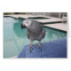 Perroquet de gris africain du Congo se tenant sur son poolside bleu de serviette et appréciant le soleil ! Plumes grises assez crantées sur un fond de vert et de bleu d'aqua. Perfectionnez pour l'amant d'oiseau dans vous !