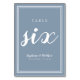 Ce design a été créé pour des célébrations mariages intimes plus petites. Simple, minimaliste et élégant Numéro de table de mariage SIX design contemporain avec une bordure à double cadre en blanc immaculé sur un arrière - plan bleu poussiéreux. Le design est chic et intemporel. Personnalisez la conception de table mariage avec vos détails mariages en lettres et en script bleu poussiéreux. Le dos de la carte est un double de l'avant. Commandez-en une pour chaque table avec les numéros de table individuels. Les tables ONE à TEN sont conçues individuellement et sont disponibles dans notre magasin InvitationSuites sur Zazzle. Bien qu'il soit spécialement conçu pour un lieu plus petit, si vous avez besoin de numéros supplémentaires, envoyez-nous un courriel à InvitationSuites@gmail.com .