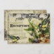 Matching Reception Information Location Card. COLOR PALETTE: yellow, tan, cream, orange, green, and black. DESIGN: This antique vintage typography inspired wedding invitation set or collection has a complete ensemble of products and has been created in several colorways. Using vintage printer's ornament decorative swirls from the baroque Victorian era, mixed with postcard flower art including lily of the valley, english violets, roses and snap dragon blossoms. A pair of yellow song birds with an open bird cage completes the front of the invite. The reverse side includes your text, which is easily customized using the template fields for personalizing. There are more swirled flourish designs, swirled line work, aged, grunged border edges and the birdcage and roses. This is a mix of vintage design elements and original watercolor backgrounds graphically designed into new art work by Audrey Jeanne Roberts.