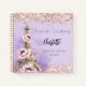 A recipe notebook for French, Parisian themed recipes. A violet background with rose gold confetti, and The Eiffel Tower, Paris with flowers. Add a name, text.